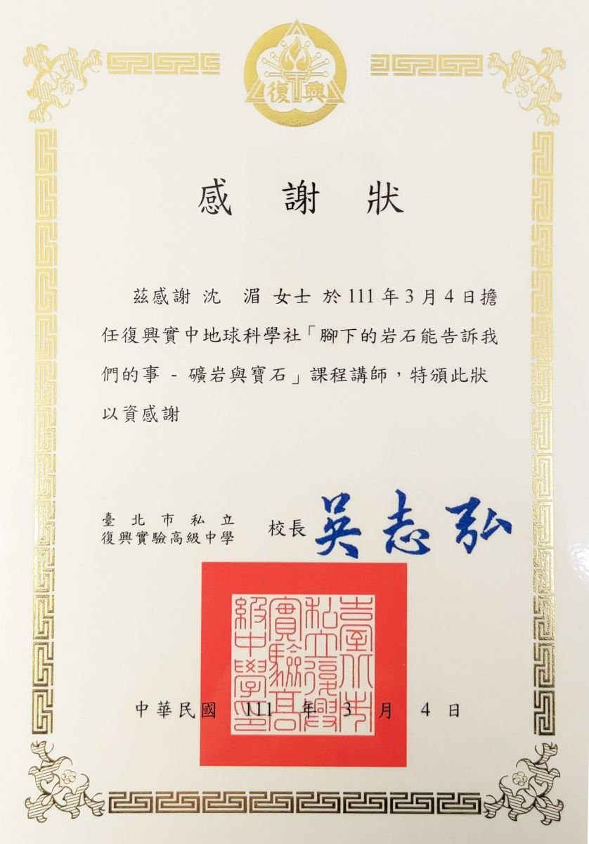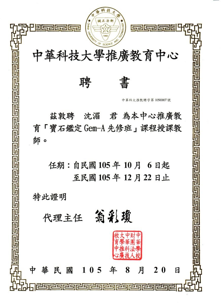 2016獲聘中華科技大學推廣教育中心寶石教育課程授課教師