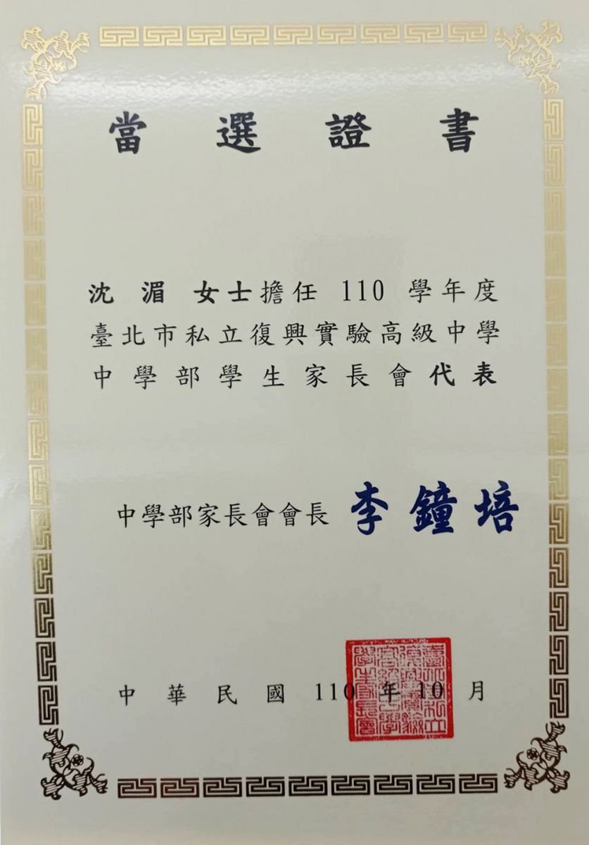 擔任110學年度 臺北市私立復興實驗高級中學 中學部學生家長會代表