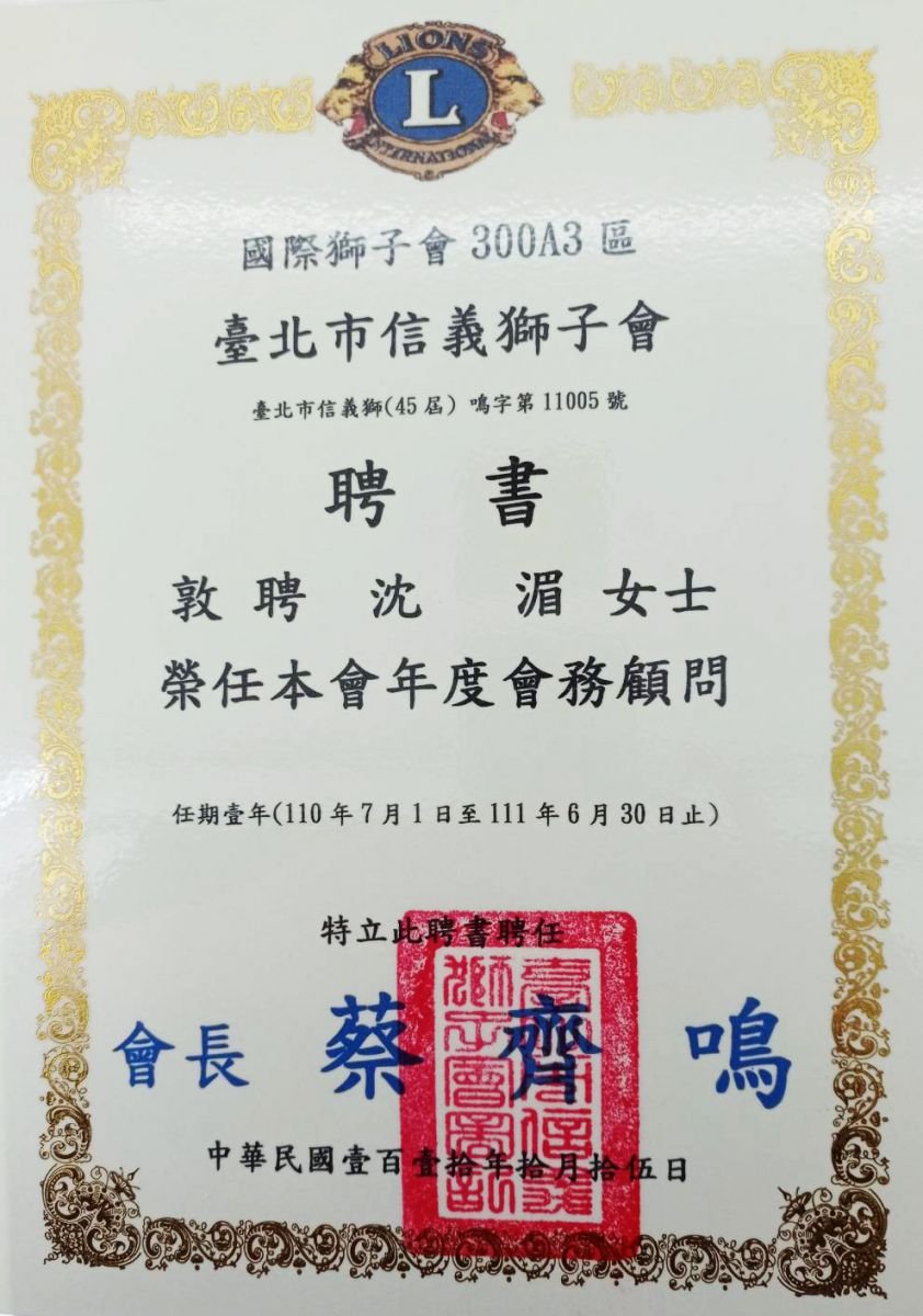 2021年7月1日-2022年6月30日 擔任國際獅子會300A3區臺北市信義獅子會年度會務顧問