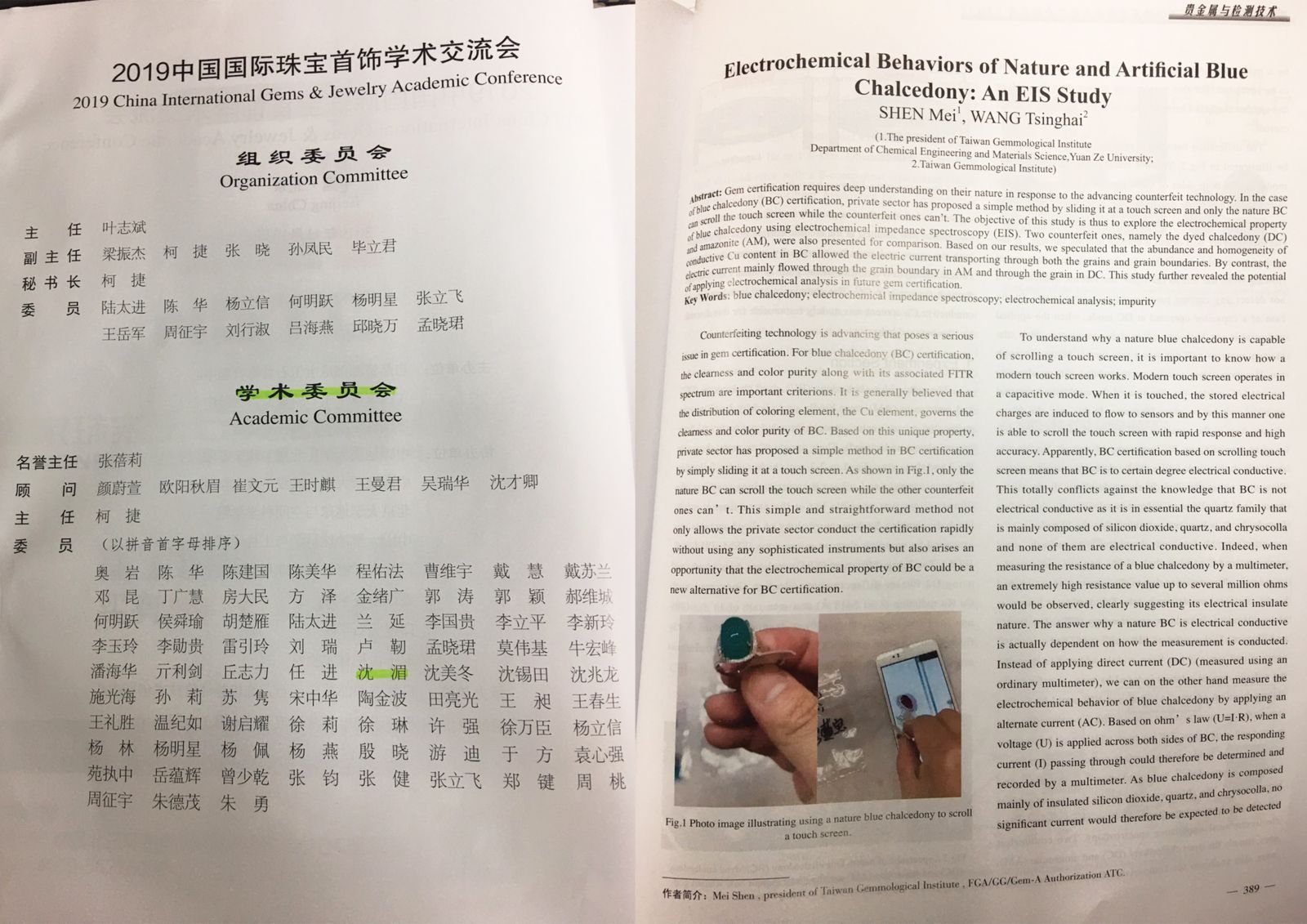 2023國際珠寶首飾學術交流會論文集 文章發表「Distinguish Blue Chalcedony from Blue Opal using Polarized Light Imaging Technology」(作者SHEN Mei, WANG Tsinghai)