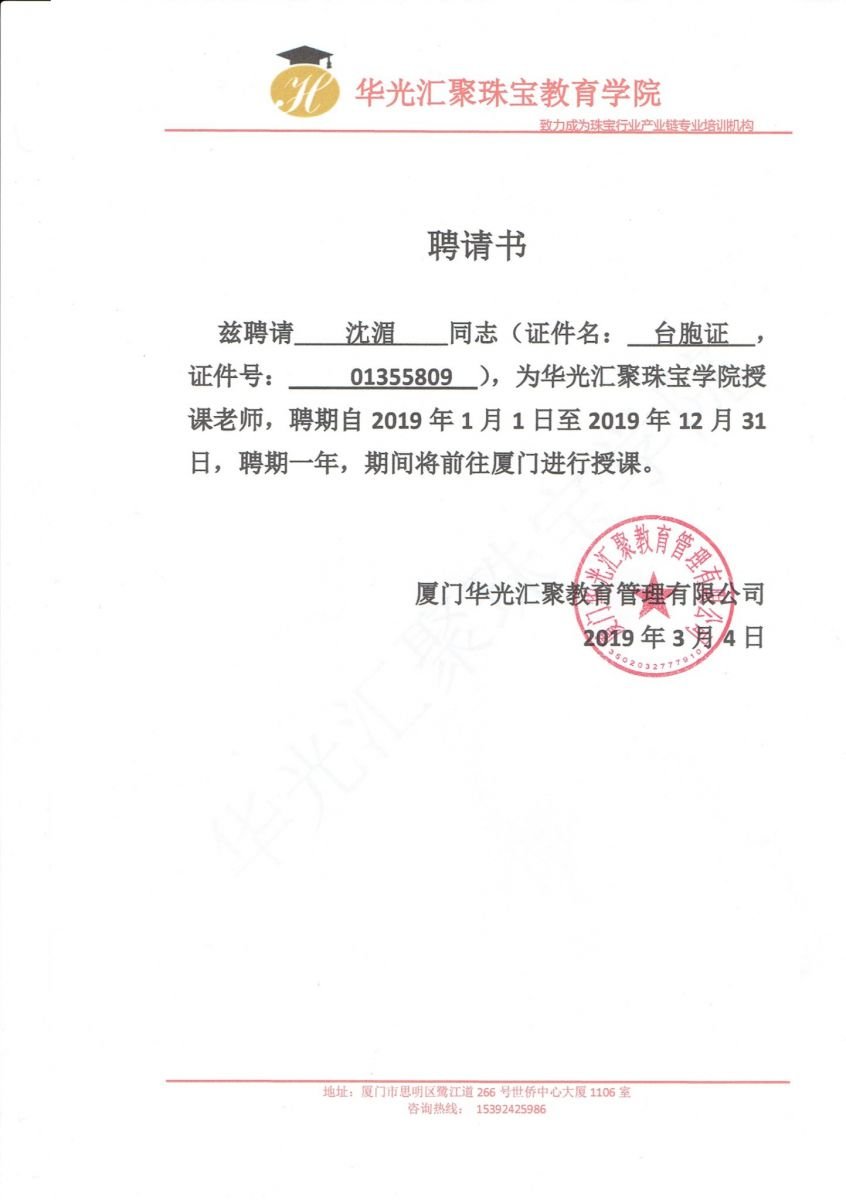 2019 華光匯聚珠寶教育學院 授課老師聘請書