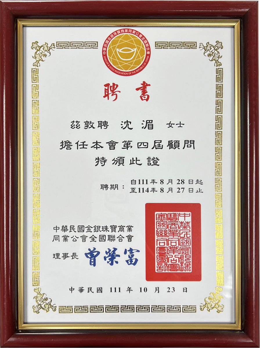 2022.08.28 擔任中華民國金銀珠寶商業同業公會全國聯合會第四屆顧問