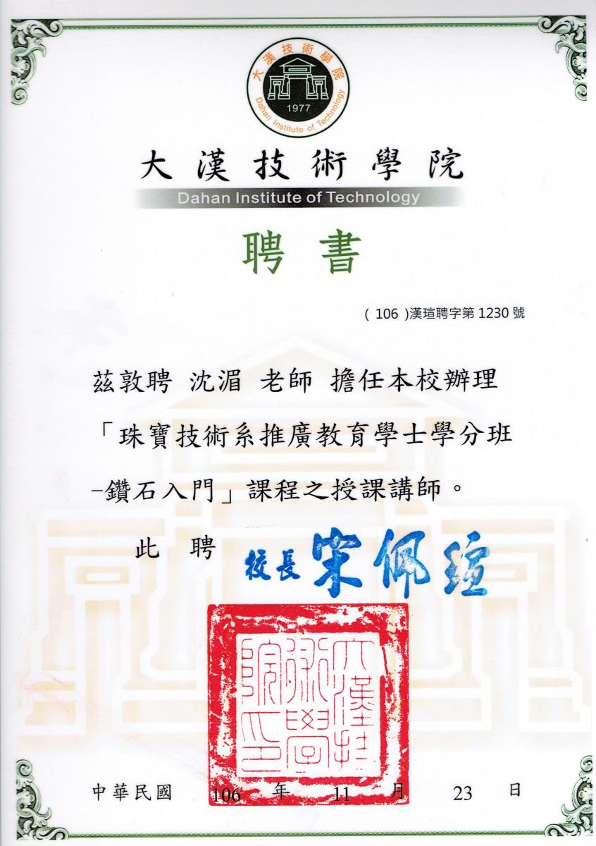 2017獲聘大漢技術學院珠寶技術系推廣教育學士學分班鑽石課程講師