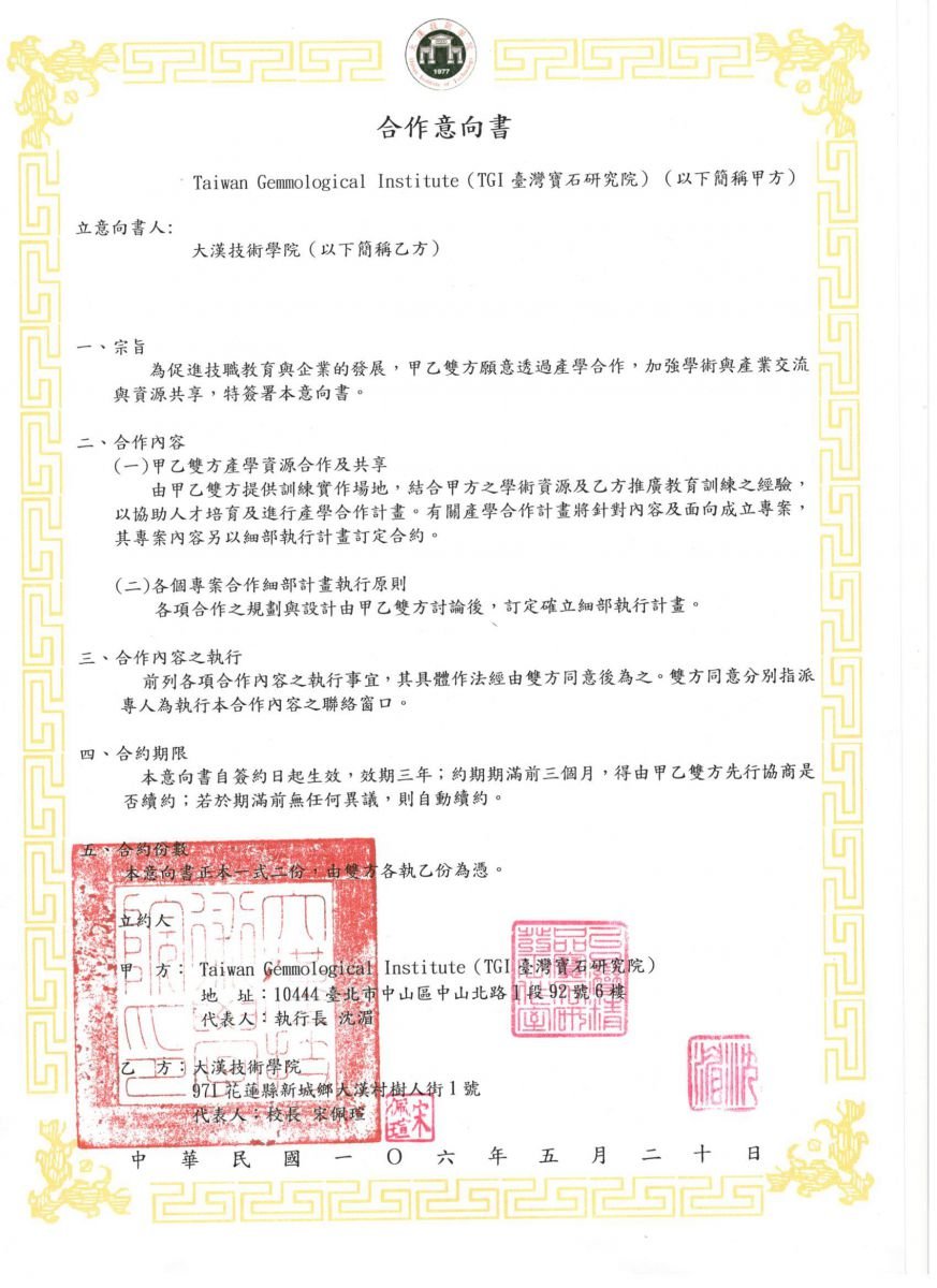 恭賀TGI中心與大漢技術學院珠寶技術系產學資源合作!
