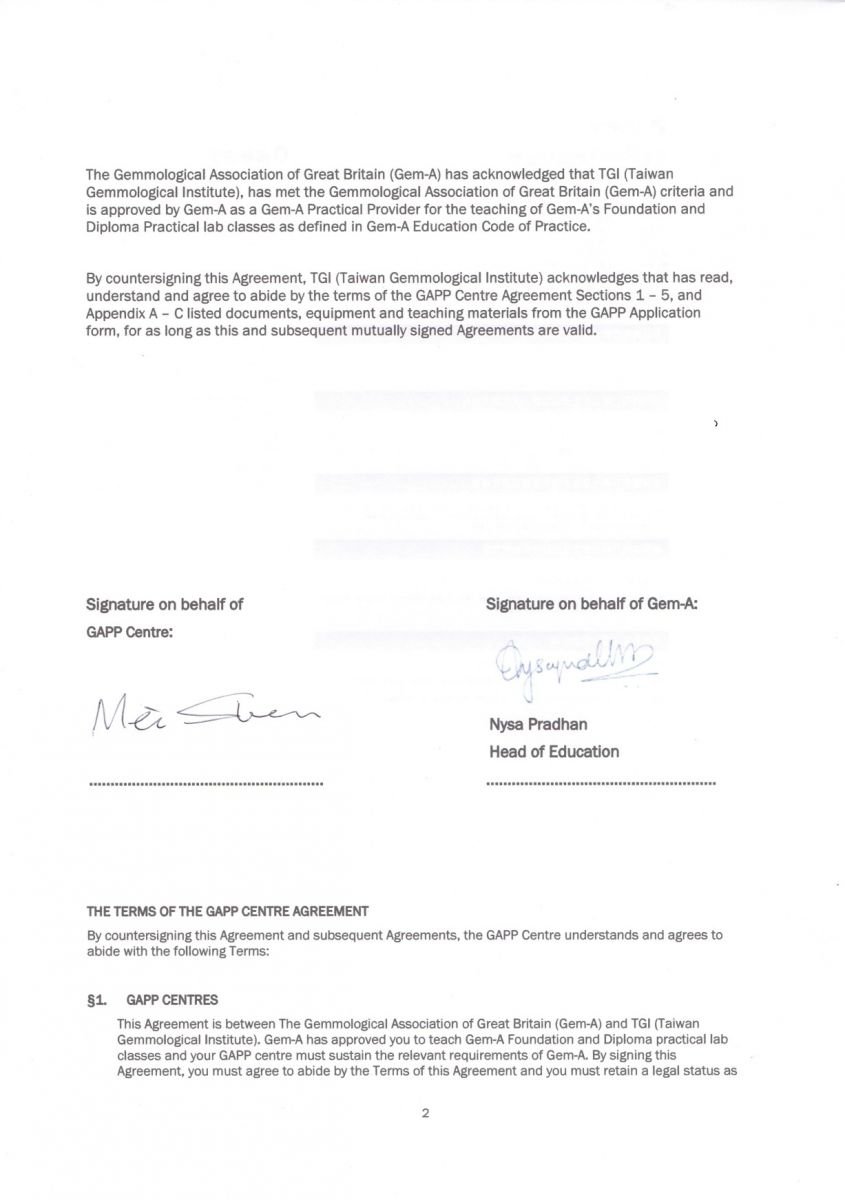 此新成立的台灣寶石研究院之授權於2012年2月份,由Gem-A 總裁 Mr. Ogden博士親自在臺北市依嚴格的標準要求下,認可了Gem-A的新教學中心的教師群,並驗證了所有用於教學的設備和寶石等,均符合Gem-A嚴格的教學要求,且Gem-A寶石學證書課程只允許在被Gem-A認可的教學中心經由Gem-A認證的教師傳授。