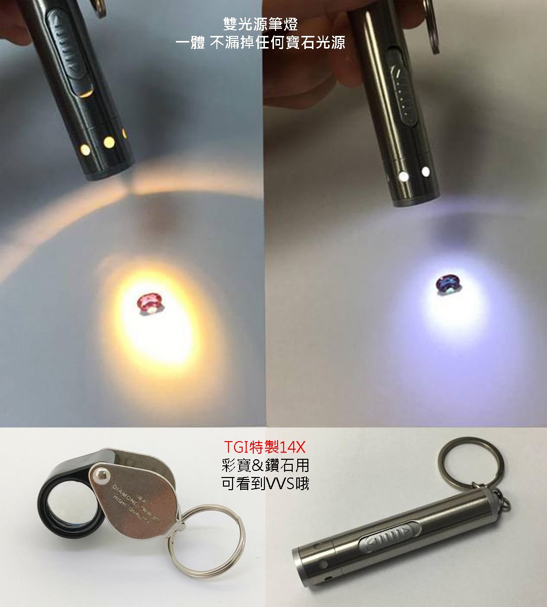 B,是燈泡光的手電筒手電筒B-Ligjt, 寶石鑑定的標準白光。但是市面上太多led燈了,沒有燈泡光,所以要特別製造。